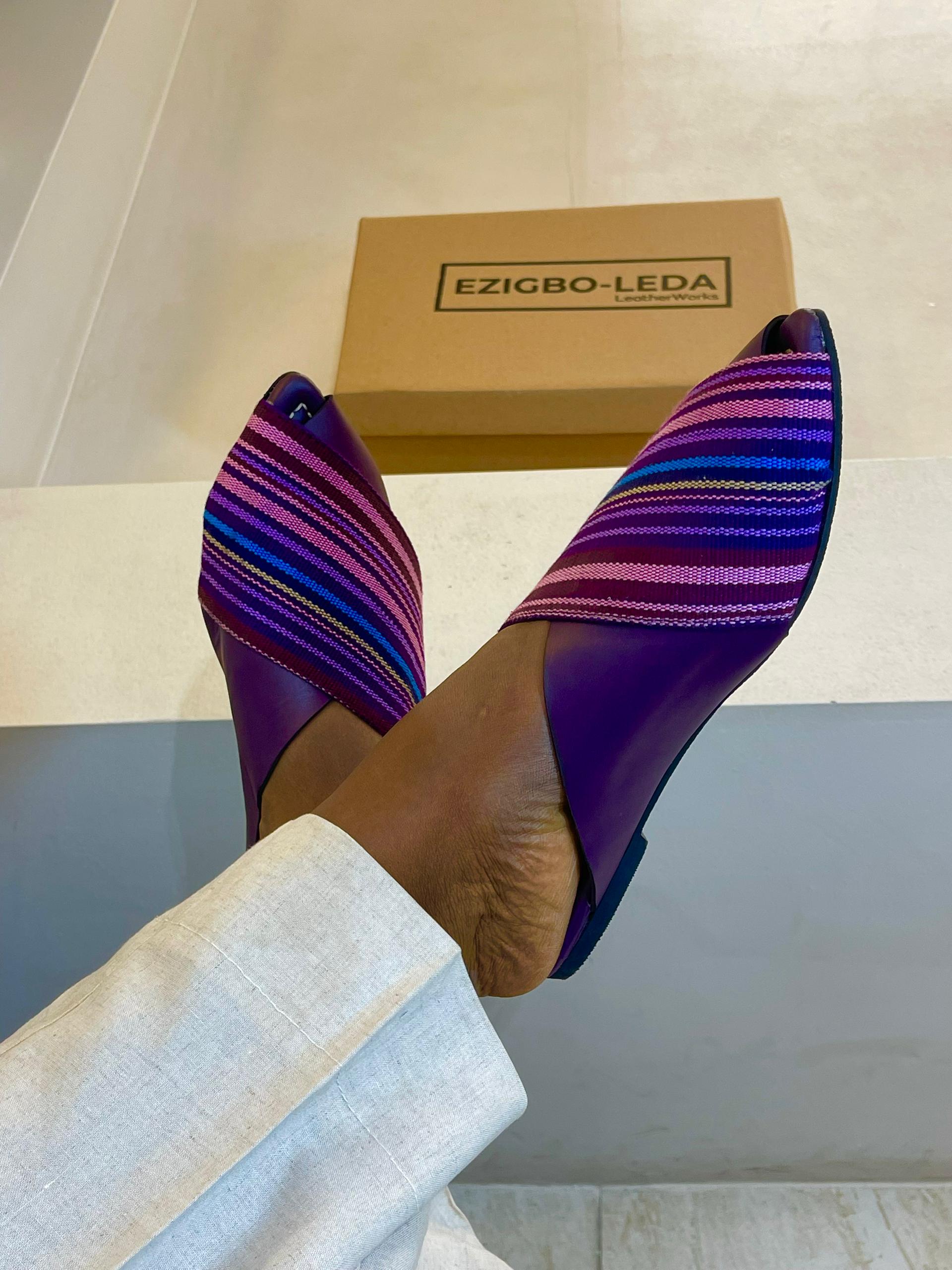 The Oma Mules in size 41 showcase the exquisite purple Aso-oke fabric, combining traditional craftsmanship with elegant design. These slippers offer a refined silhouette that complements both casual and formal ensembles, delivering comfort and timeless style in every step.